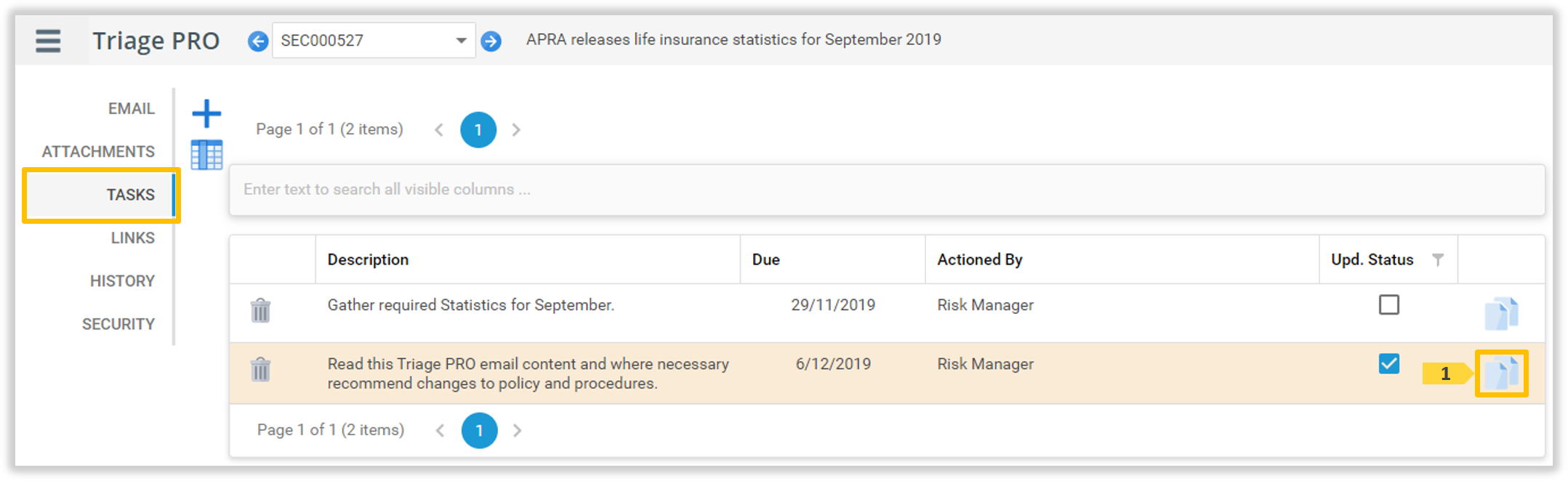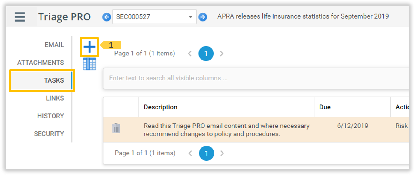 | 1 | Triage PRO number and Title | The Triage PRO record to which the new task is being added. |