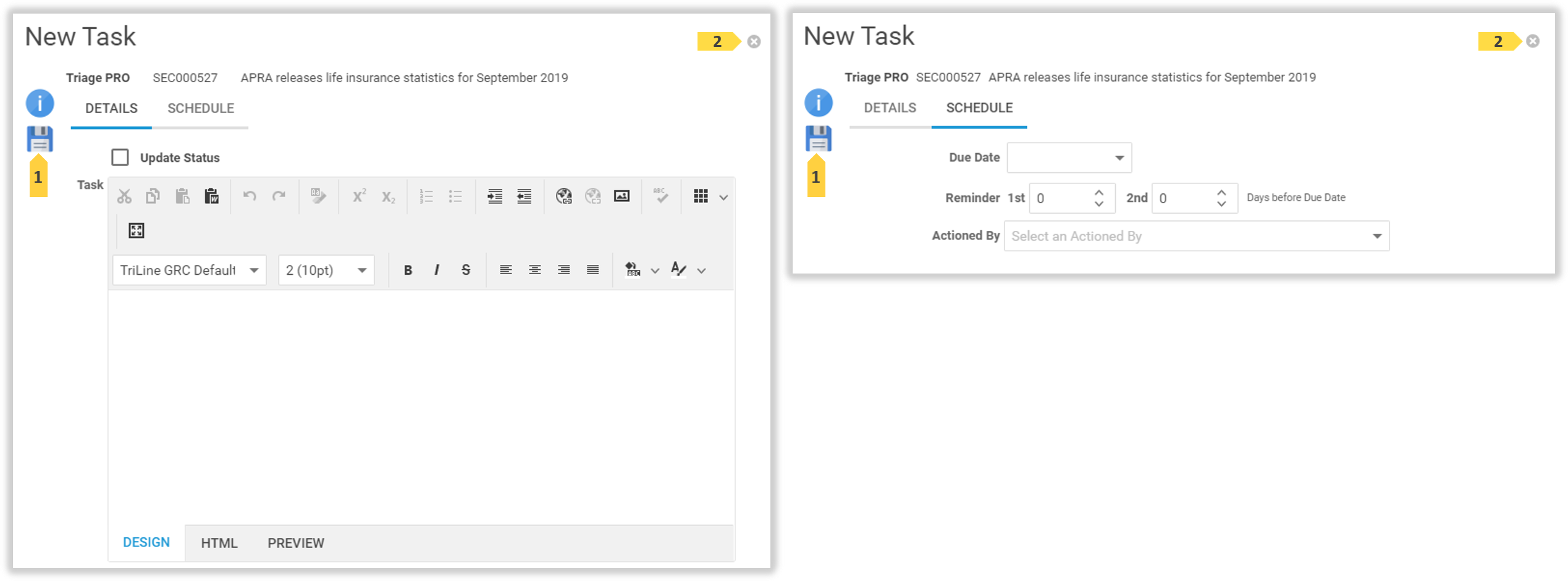 The New Task window displays. Enter the required fields on the Details tab tab. Click the the Schedule tab and enter the required fields. Click the Save icon 1 to save this new Task. (Or, click the Cancel icon 2 to stop adding the new Task.)