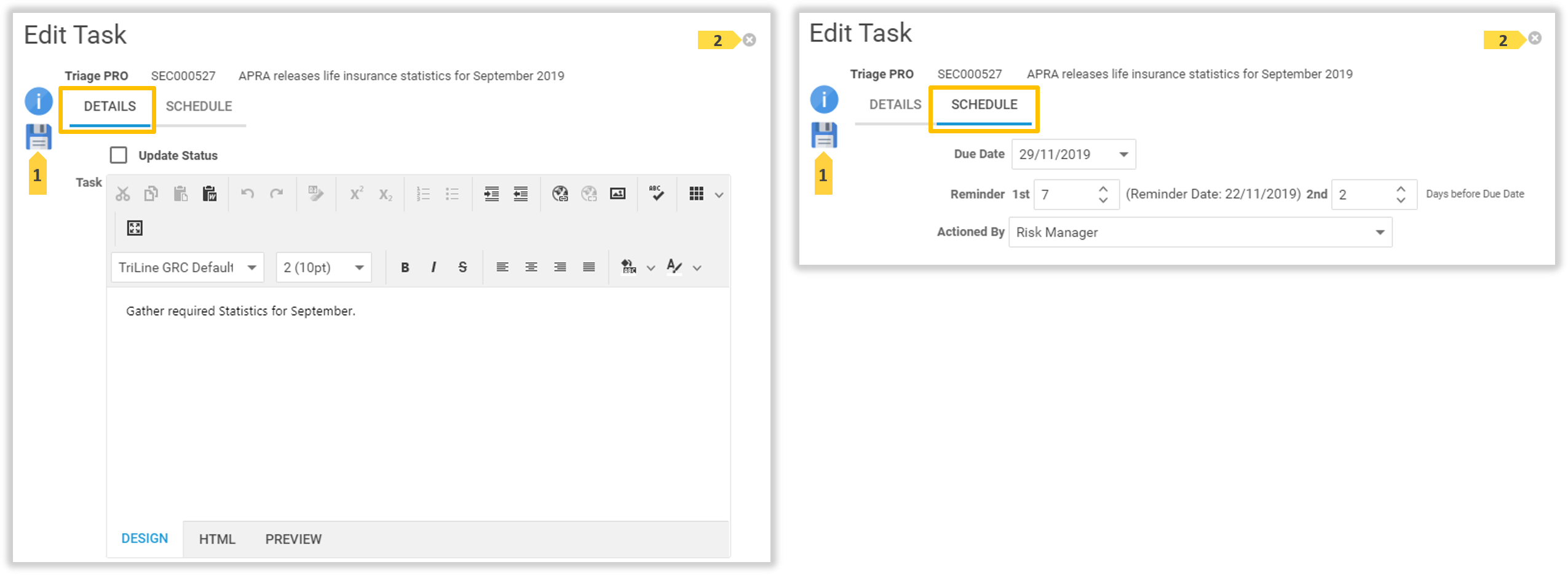 The Edit Task window displays. Update the required fields on the Details and Schedule tabs. Click the Save icon 1 to save the editing. (Or, click the Cancel icon 2 to abandon the editing.)