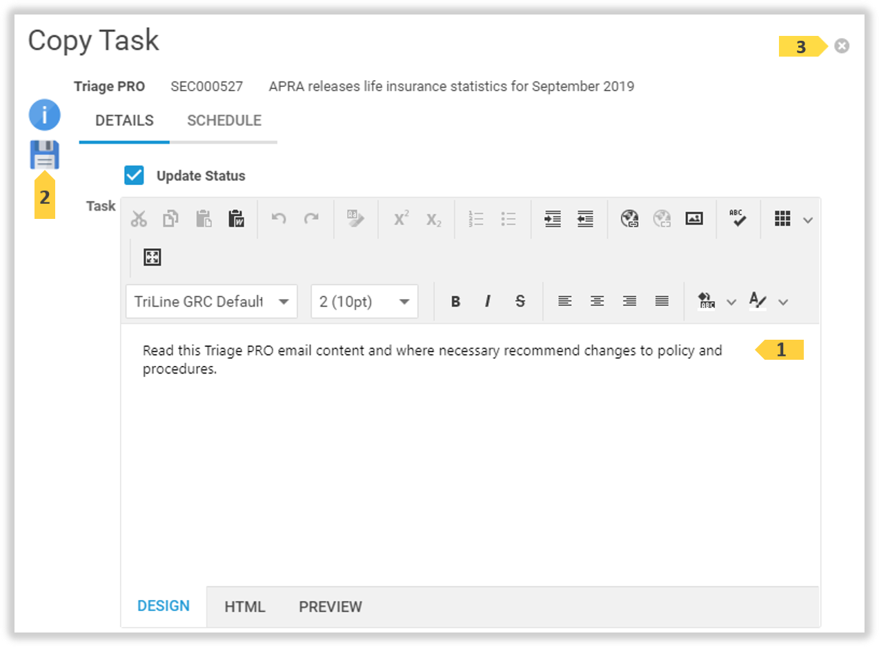 The Copy Task window displays. As required, update the fields on the Details 1 and Schedule tabs. Click the Save icon 2 to save the copy. (Or, click the Cancel icon 3 to abandon the copy.)