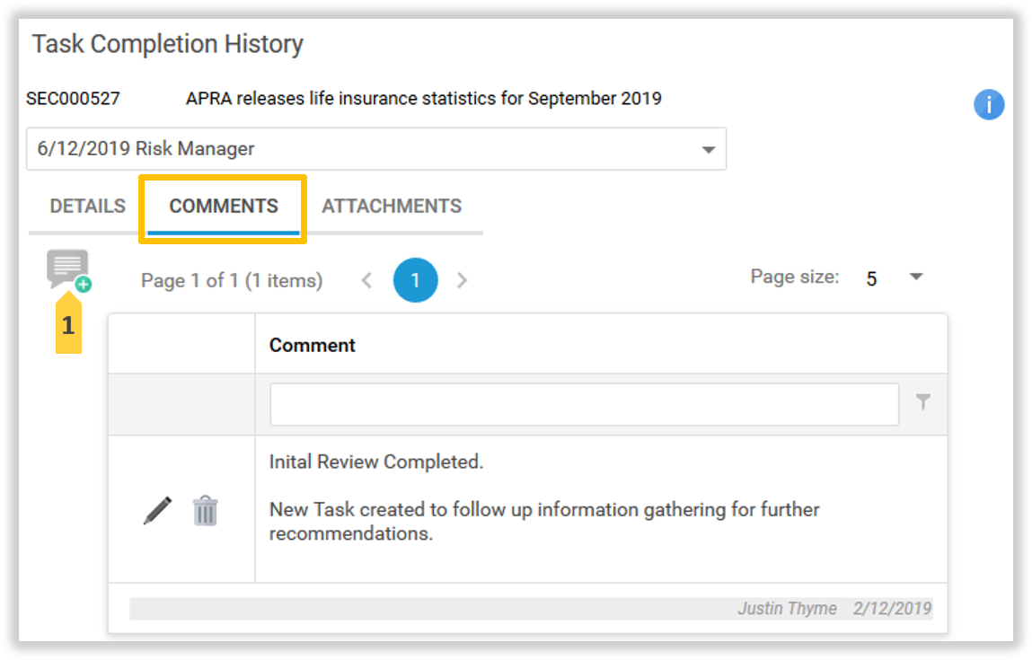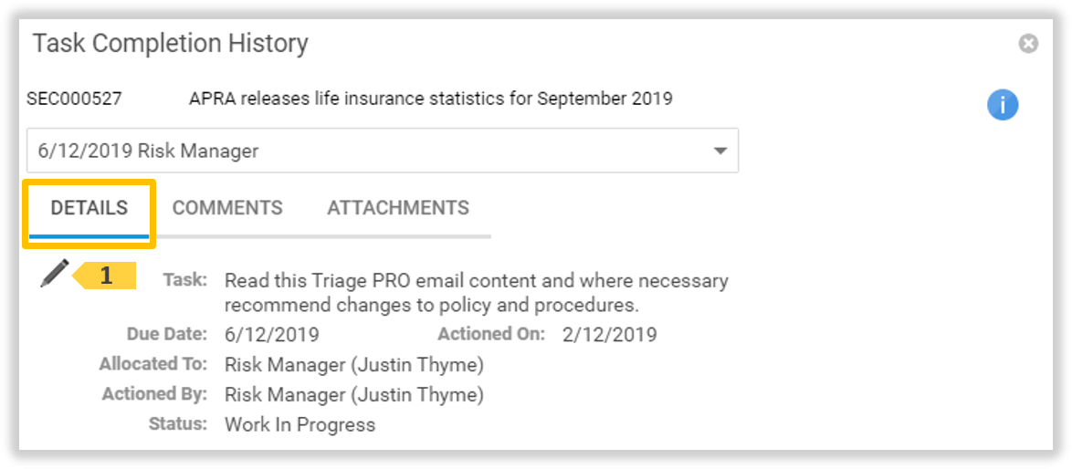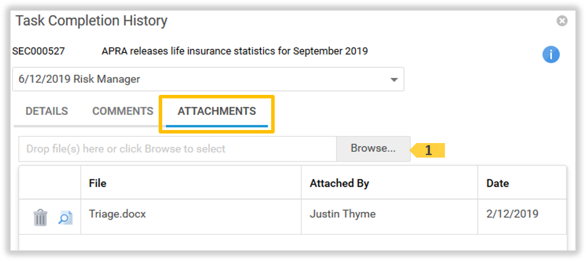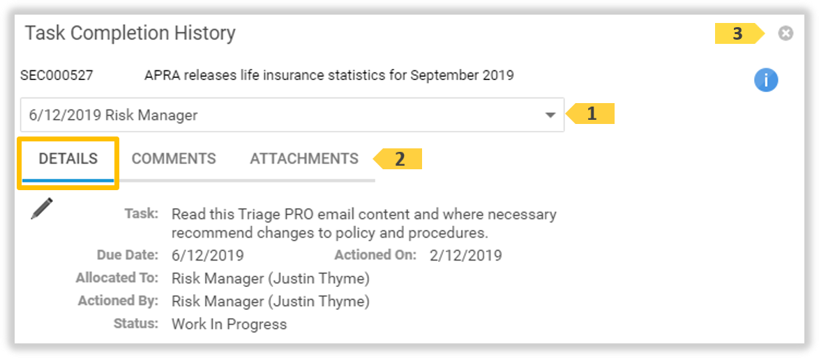 The ‘Task Completion History’ window displays. The most recent completed task history record is displayed. If the ‘Due Date/Actioned By’ 1 field appears, it indicates that more one task completion history record exists for this Task. Click the ‘Due Date/Actioned By’ dropdown 1 to select the other Completed Task History records. Also click the Comments tab and the Attachments tab 2 to see that information for this History Record. If you have the correct security access, further comments can be added and removed, and attachments can be added or removed. Click the Close icon 3 when viewing is completed to close this window.