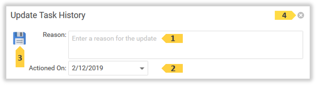 The ‘Update Task Completion History’ window displays. Enter a Reason 1 for the update in the Reason field. Change the ‘Actioned On’ 2 date if required. Click the Save 4 icon to Update. Click the Cancel 5 icon to cancel the Update and close this window. Saved Updates will appear on the Comments tab.