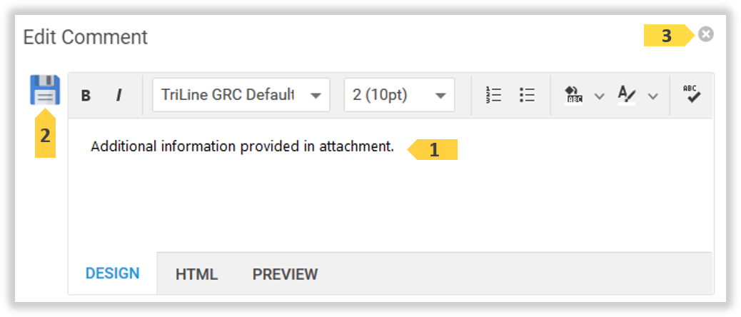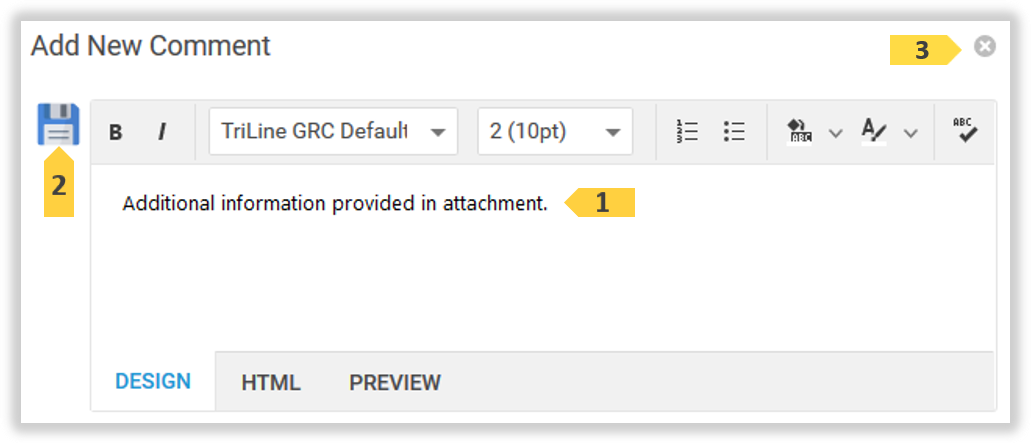 The Add New Comment window displays. Enter a new Comment 1. Click the Save 2 icon to save this comment. (Click the Cancel 3 to cancel the save and close this window.)
