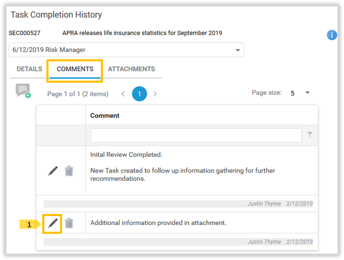 The Edit Comment window displays. Update the comment 1. Click the Click the Save 2 icon to save this comment.