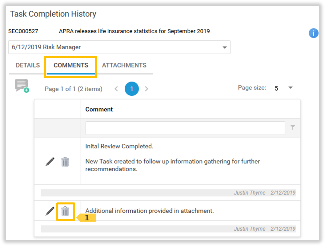 To delete a Comment, Click the Delete 1 icon. Click OK to confirm the delete.