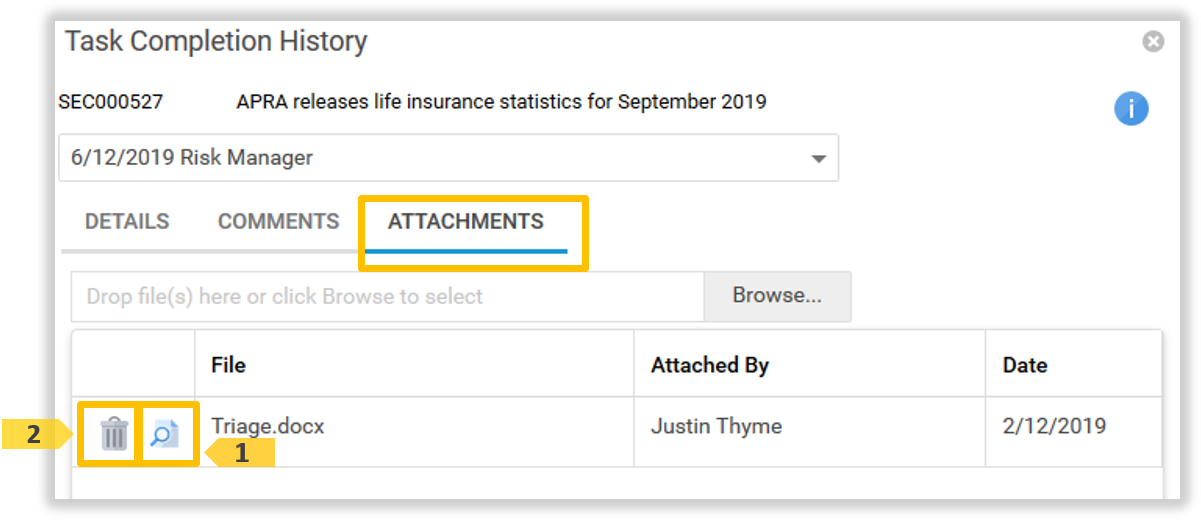 Click the View 1 icon to view the attachment. Click the Delete 2 to delete the attachment.
