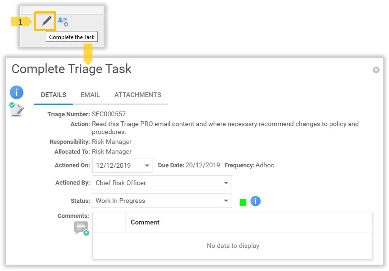 A Triage PRO task requires a comment, so clicking the pencil 1 icon complete option is the only complete option available.