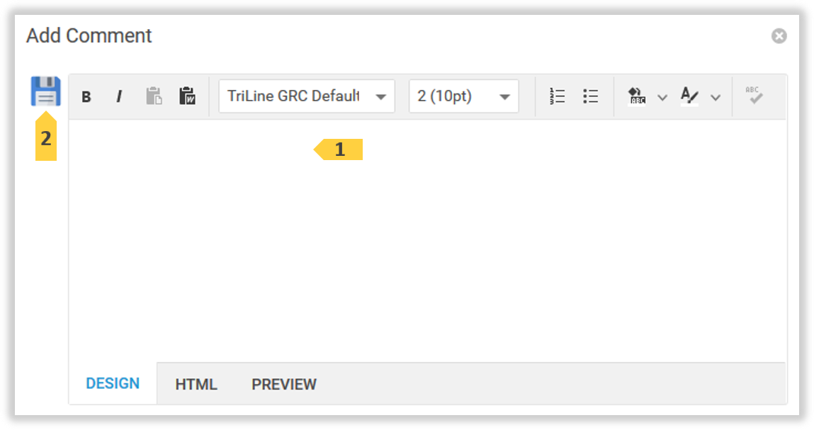 The Add Comment window displays. Enter in your text 1, then click the Save 2 icon; or click the Cancel icon to stop adding a comment.