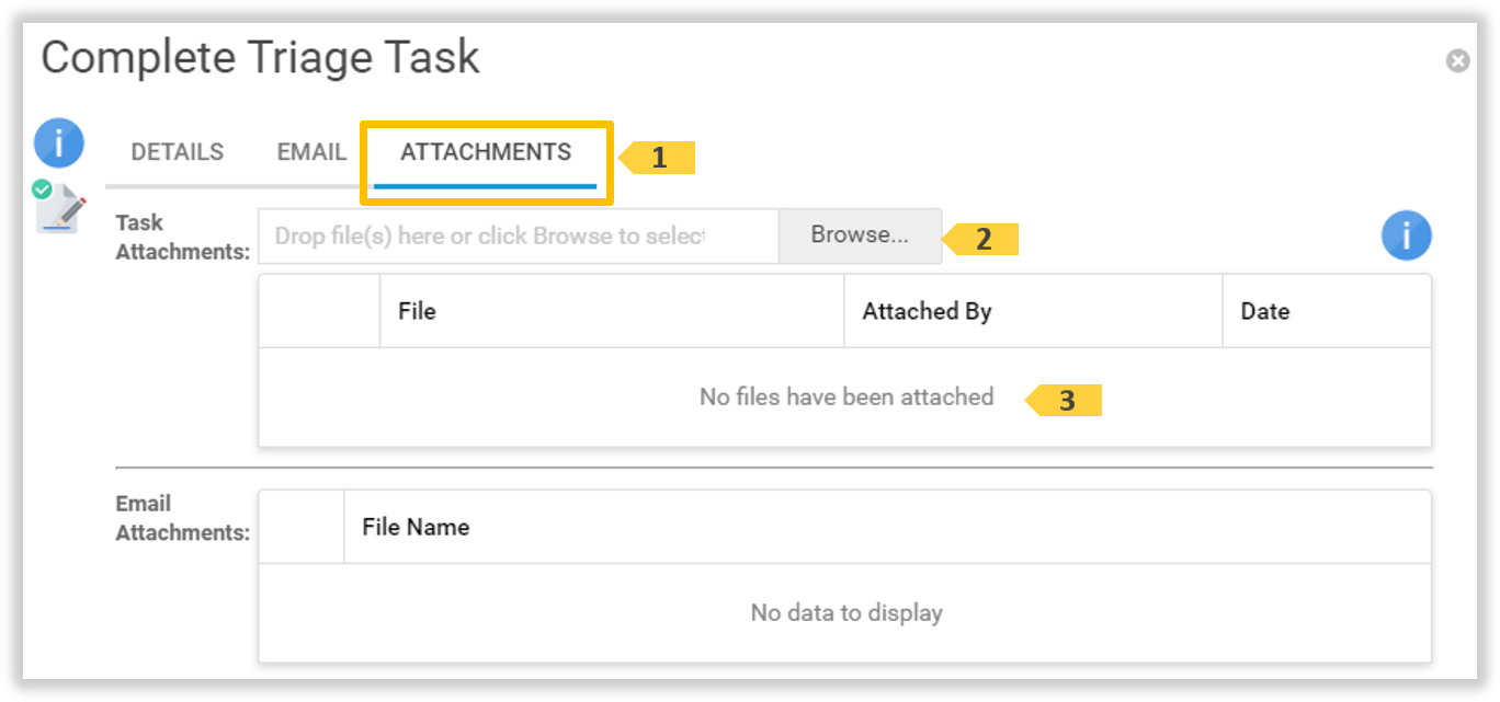 To add an attachment, click the Attachments 1 tab. Drop file(s) in the Browse field, or click Browse 2 to locate and select the file(s) you wish to attach. Files can be also be attached one at a time. After a few seconds the files will re-appear into the File attachment list 3.